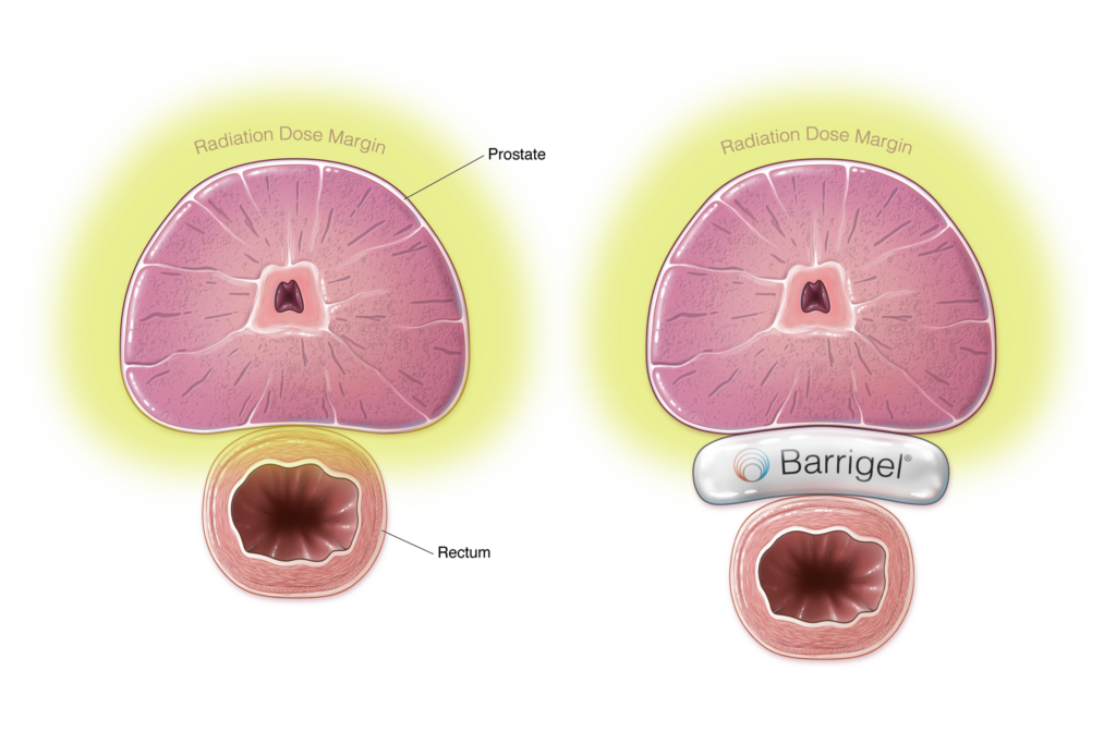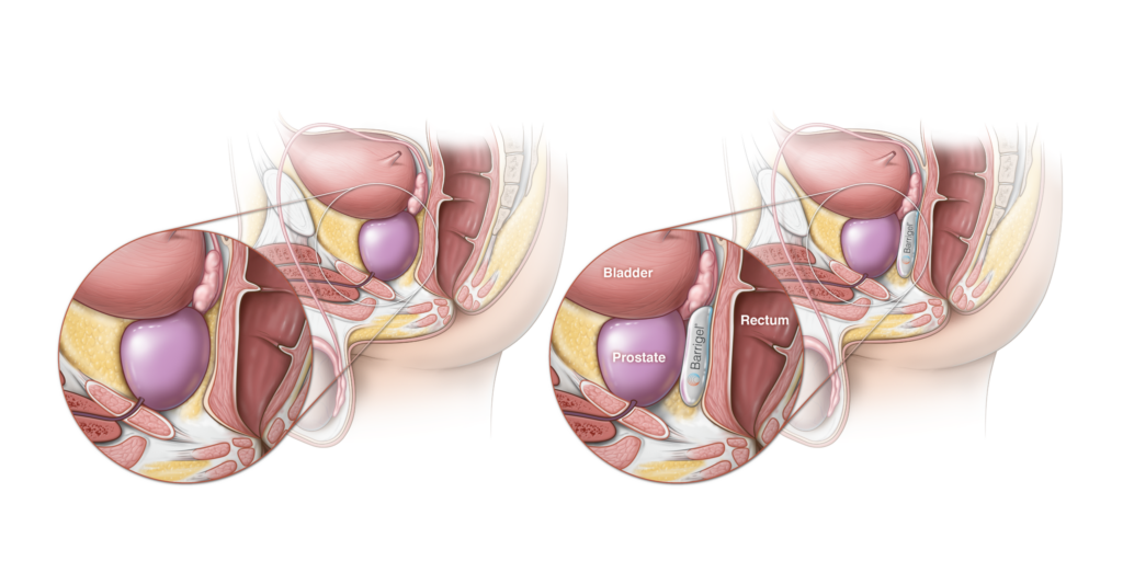 Rectal spacers can help minimize prostate radiation side effects by temporarily positioning the rectum away from the prostate. When inserted, Barrigel creates space between the prostate and the rectum, moving the healthy organ out of radiation beam exposure.